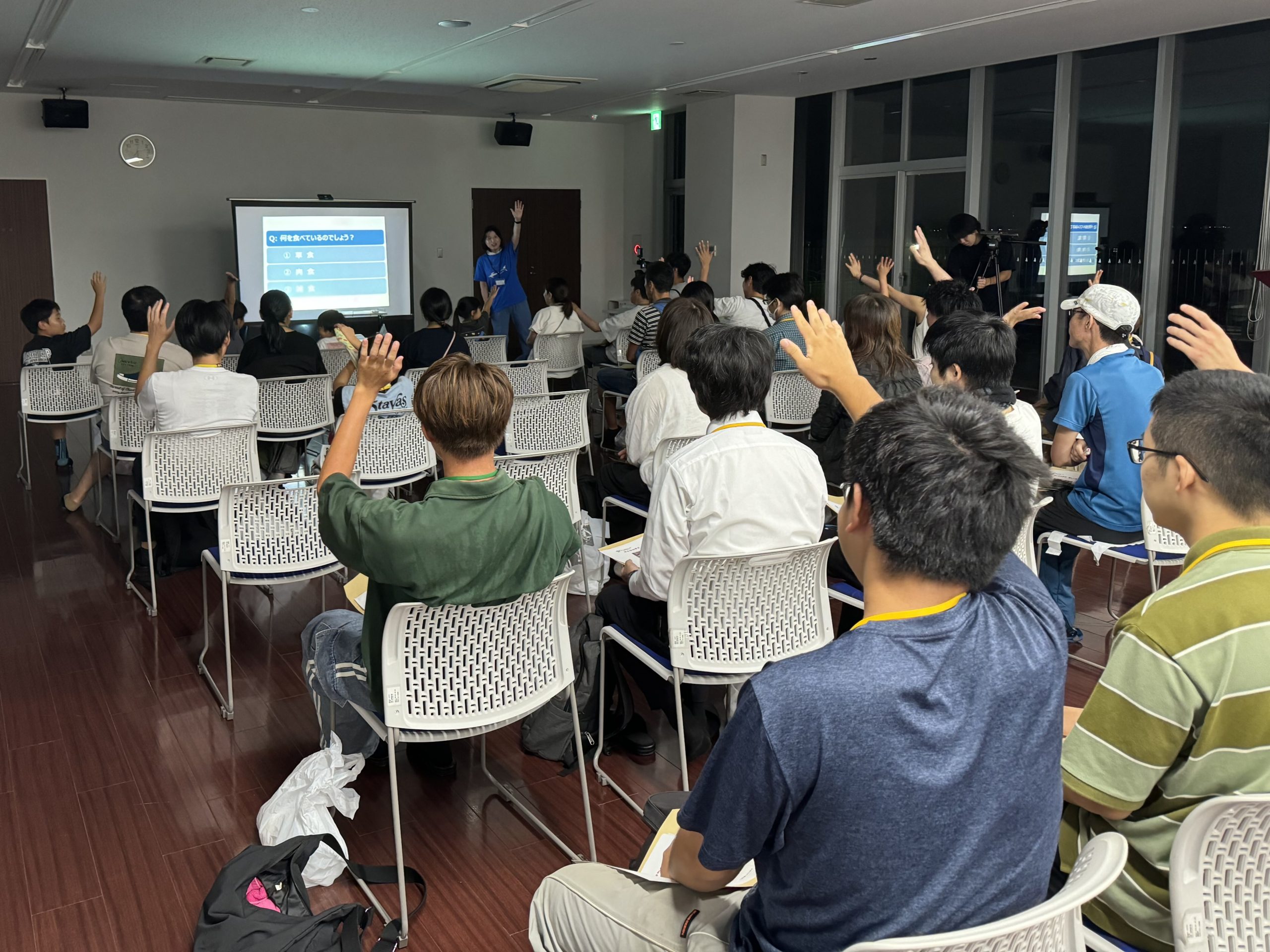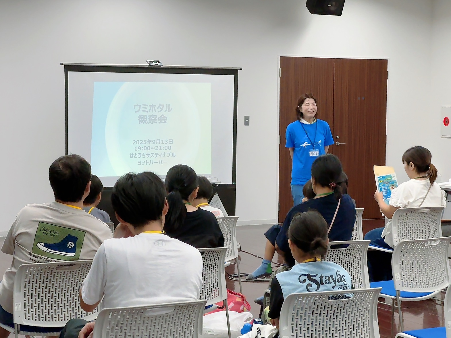 9月13日(土)高松市浜ノ町のせとうちサスティナブルヨットハーバー及び大的場海岸にて、「ウミホタル観察講座」を開催し大人と子ども合わせて34名が受講しました。はじめに、クイズを交えながら光る海の生き物についての説明がありました。続いて、ウミホタルの生態について、イラストや図を用いて分かりやすく解説いただきました。ウミホタルは夜行性で、日中は海底の砂の中に隠れて生活しています。海の動物の死骸などを食べることから、「海の掃除屋」とも呼ばれているそうです。また、発光の仕組みについては、昆虫のホタルが体の尾部を光らせるのに対し、ウミホタルは口から吐き出す液体が海水中の酵素と反応して光るという違いがあることが紹介されました。ウミホタルが光る理由としては、外敵への威嚇、求愛、縄張りの主張、仲間への危険の知らせなど、様々な役割があるそうです。そして、ウミホタルは日本固有種であり、瀬戸内海にも生息していることから、「瀬戸内海の恵みに感謝し、大切にしていきましょう」との呼びかけがありました。
