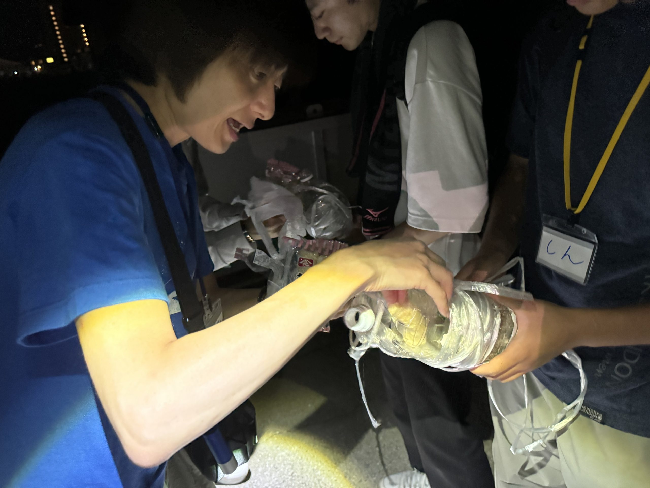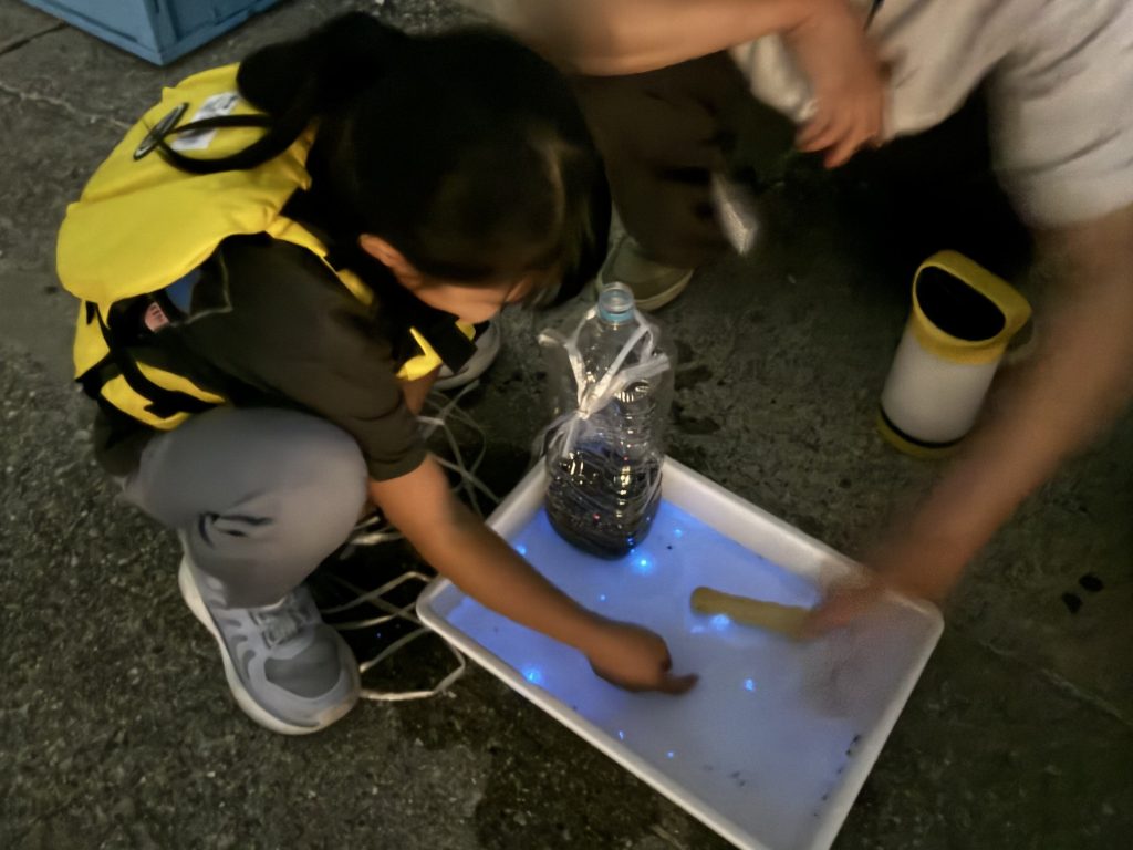 採集ポイントでは、投げ入れ方の注意事項について説明がありました。利き手と反対の手にヒモの輪を通し、利き手で採集装置を2~3メートル先へ投げ入れた後、ゆっくりと後ろに下がって静かに待ちました。約10分後、ヒモをたぐり寄せて採集装置を引き上げると、装置がうっすら青く光っている様子が確認できました。採集装置の中の海水をパレットに移し、手でかき混ぜたり写真を撮ったりしながら、大人も子どもも夢中になってウミホタルの光を楽しみました。また、採集装置に残った鯛ちくわを取り出してこすったり、パレットに氷を入れて温度刺激を与えることで、光が強くなる様子も観察できました。
