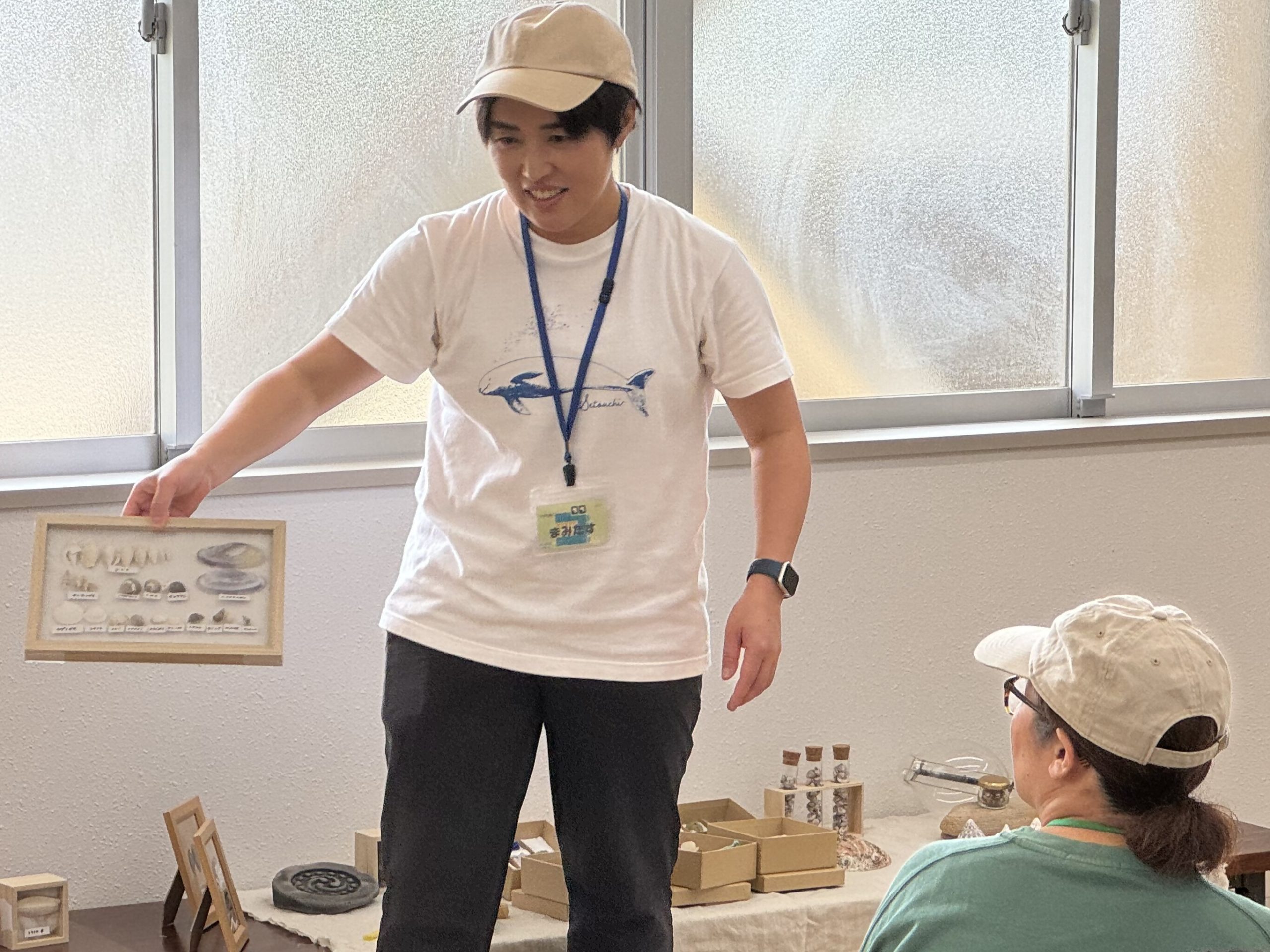 はじめに、講師の幸池氏より標本を用いた漂着物の解説がありました。漂着物の一つとして知られるシーグラスは、波にもまれて角が取れたガラス片のことで、長い年月をかけて形成される形の違いを楽しむことができるそうです。また、浜辺には多様な種類の貝殻が見られ、それぞれの貝殻から生息していた生き物を想像することも観察の楽しみの一つであると紹介がありました。さらに、現在では漂着物を拾って楽しむビーチコーミングが世界中で楽しまれていますが、かつては浜に流れ着いた流木などを生活の中で活用していたことや、平安時代から漂着物が利用されていたというお話もありました。