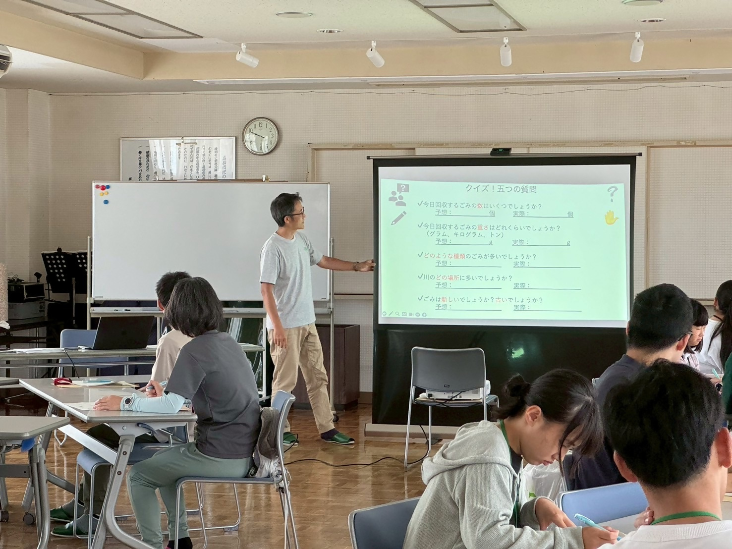 公民館に戻り、回収したごみを種類ごとに分別し、それぞれの重さや個数を計測しました。さらに、ペットボトルや食品包装については、製造年月日やメーカーを調査し、ごみが新しいものか古いものか、どのような経路で流入したのかについて各グループで話し合いを行いました。その後、調査結果をグループごとに発表しました。調査の結果、プラスチックごみやタバコの吸い殻、発泡スチロールなどが多く見られ、比較的最近捨てられたものが多いことが分かりました。これらはポイ捨てや不法投棄など意図して捨てられたものと考えられ、対策としてごみ箱の設置が必要という意見もありました。また、近隣の新川と春日川ではごみの種類が異なることから、地域による特徴があるという意見や、川の段階でごみを回収することで、マイクロプラスチックの海洋流出を防ぐことにつながるといった意見も挙がりました。