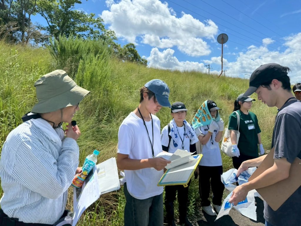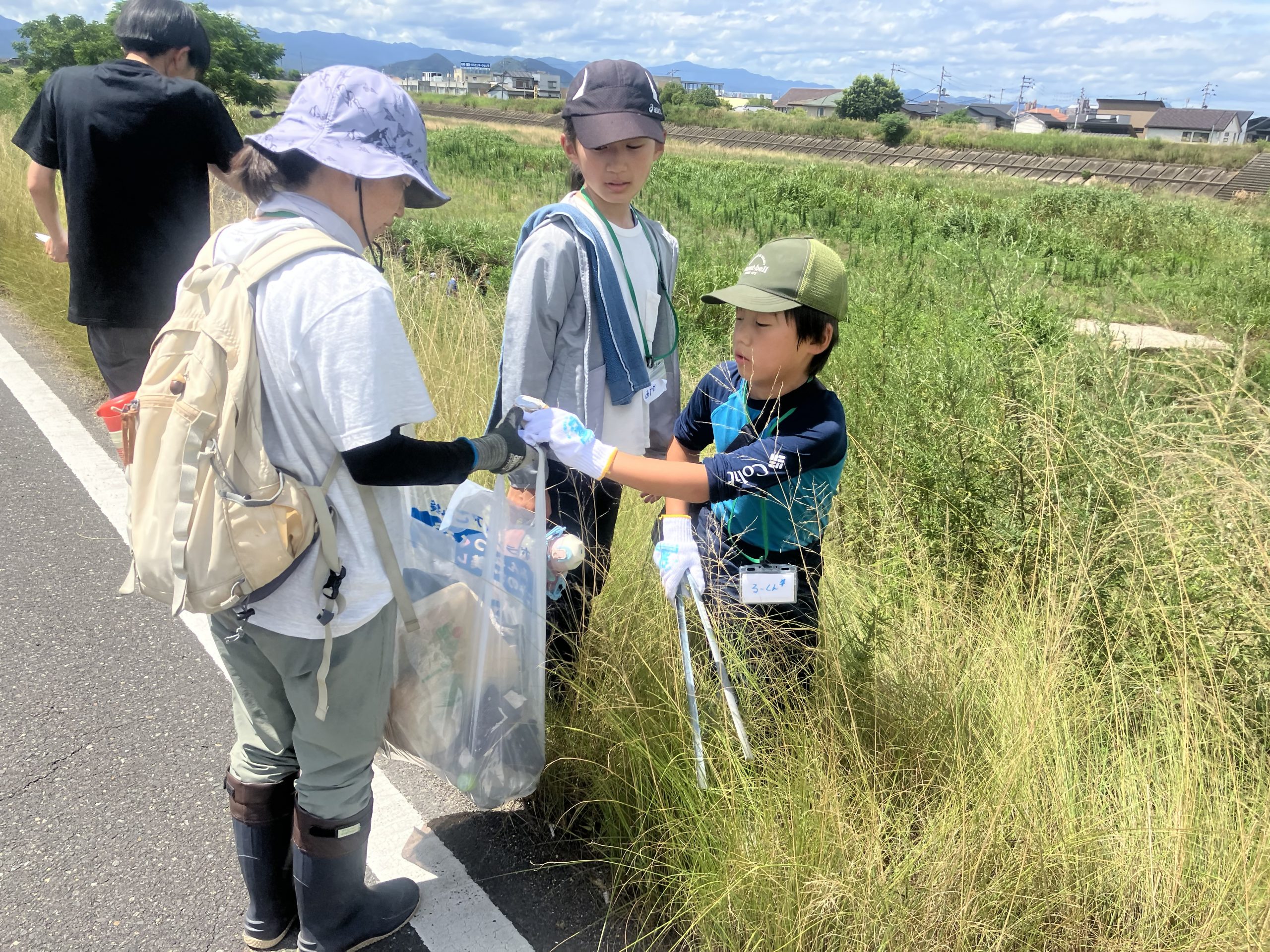 当日の春日川周辺は、草木が大人の背丈ほどに伸びており、川の様子が見えづらい状況でした。川沿いの道路には、タバコの吸い殻や食品包装などのごみが多く見られ、堤防沿いの草地には風で飛ばされたトレイやビニール袋が引っかかっていました。さらに、川の近くでは農業用資材の袋やペットボトル、缶類などのごみも多く確認されました。厳しい暑さの中ではありましたが、受講者は少しでも川をきれいにしようと、熱心にごみの回収に取り組んでいました。