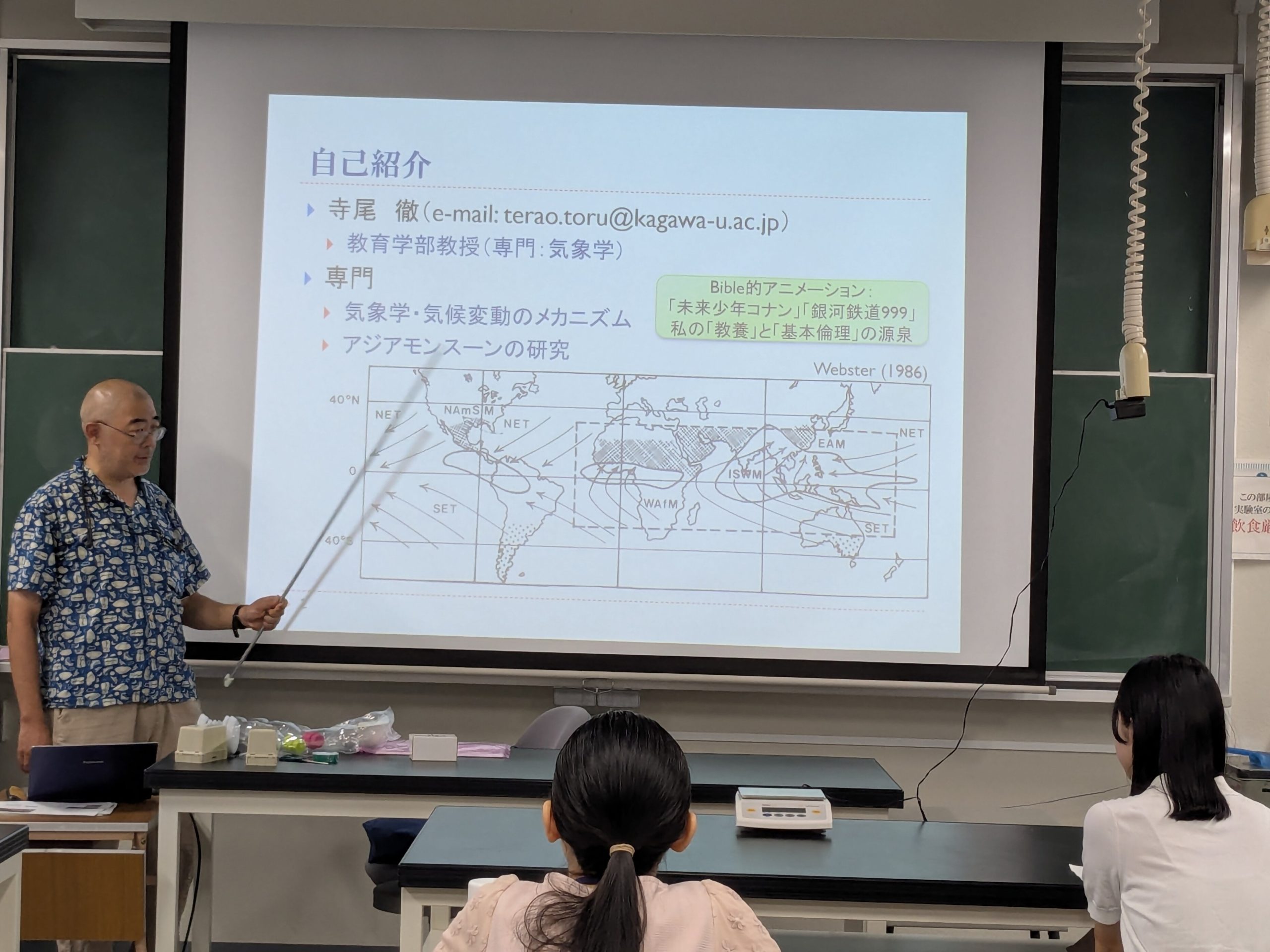 はじめに、寺尾先生より、アジアモンスーンに関するご自身の研究について、インドやバングラデシュでの活動の様子や研究チームの仲間との写真も交えて紹介がありました。中には、太平洋東端の水温が上がるとバングラデシュでコレラ患者が増えるなど、一見無関係に見える事象が実は関連しているという思いもよらない事例もあるそうで、データと仮説がかみ合う瞬間こそが気象学の面白さであると語られ、講座は和やかな雰囲気で進みました。