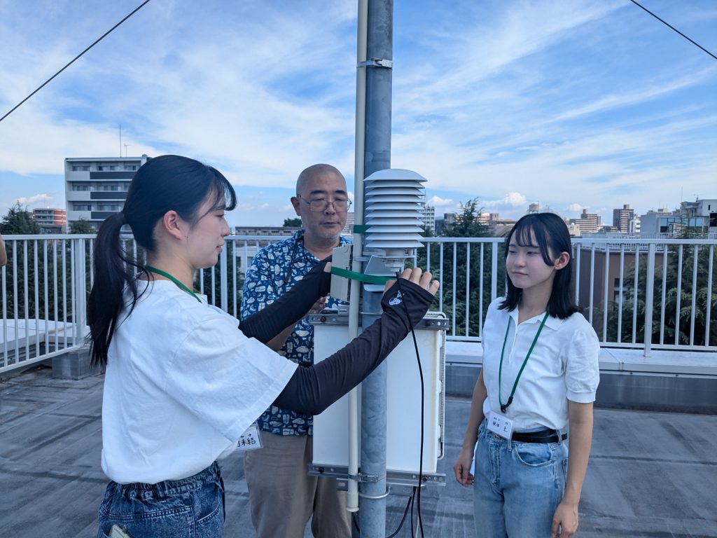 香川大学周辺の地図を見ると、南西方向に標高約320mの峰山があり、昼は山に向かって吹き上げる谷風、夜は山から吹き下ろす山風が吹くと考えられます。寺尾先生は、この峰山からの冷気を観察するため、複数の地点に温度計を設置しているそうです。今回は香川大学屋上に温度計を設置して気象観測の方法を体験しました。また、屋上には風速計や雨量計も設置されており、それらの機器についても解説がありました。