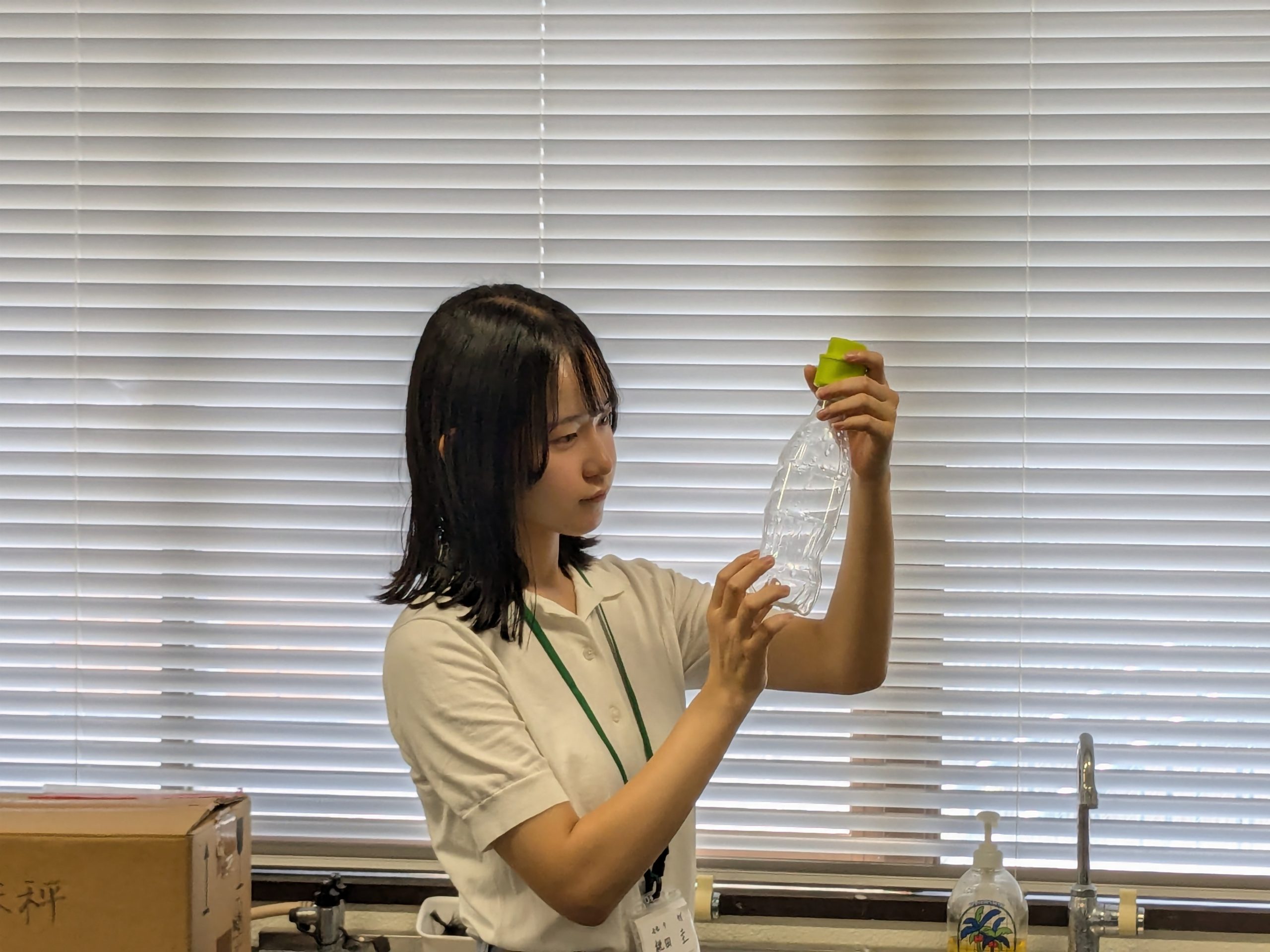 続いて、大気のお話がありました。寺尾先生から「1m3あたりの大気の重さは?」という質問があり、受講者は普段考えたことのない問いに驚きながら答えていました。実験では、ペットボトルの重さを計量し、その後炭酸キーパーで空気を入れて再度計測する比較実験を行い、大気に質量があることを確認しました。さらに、大気質量に関する映像を視聴し、周囲の大気1m3あたり約1.2kgの質量があることや、気圧とは上空の大気の重さであり、標高が高いほど気圧が低くなることについて解説がありました。