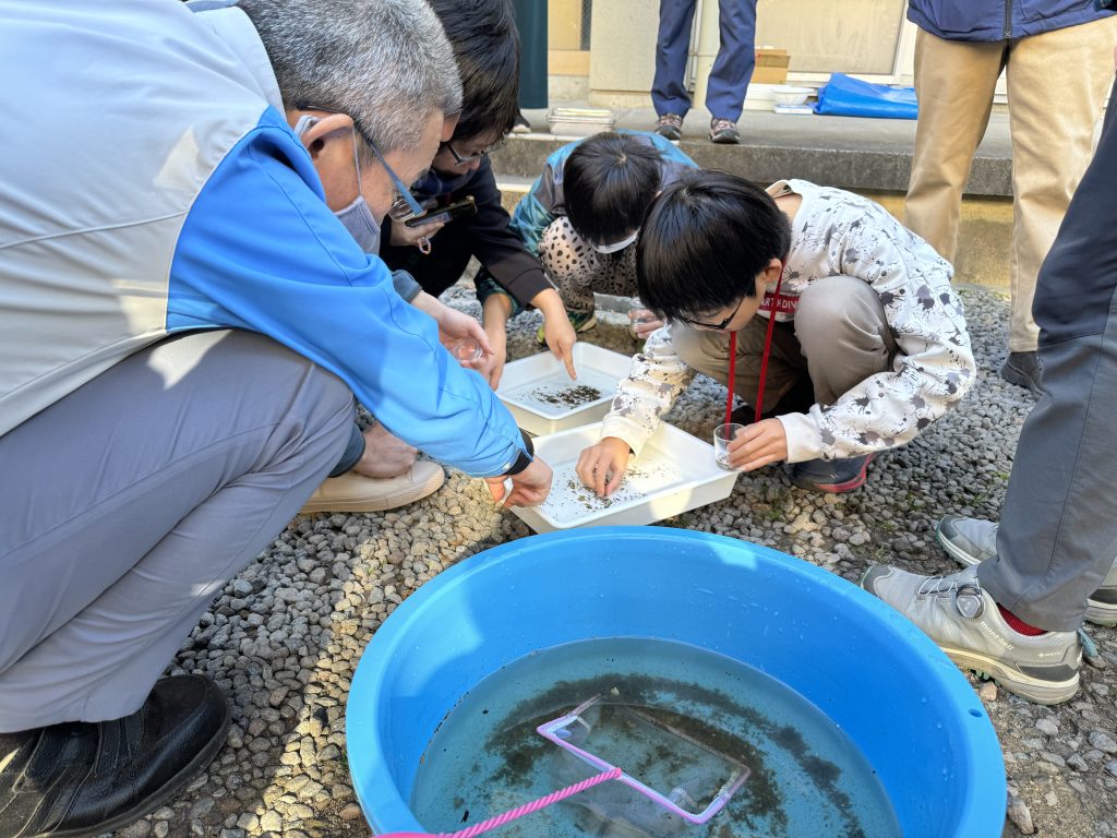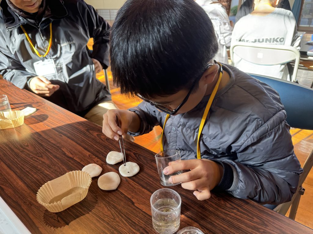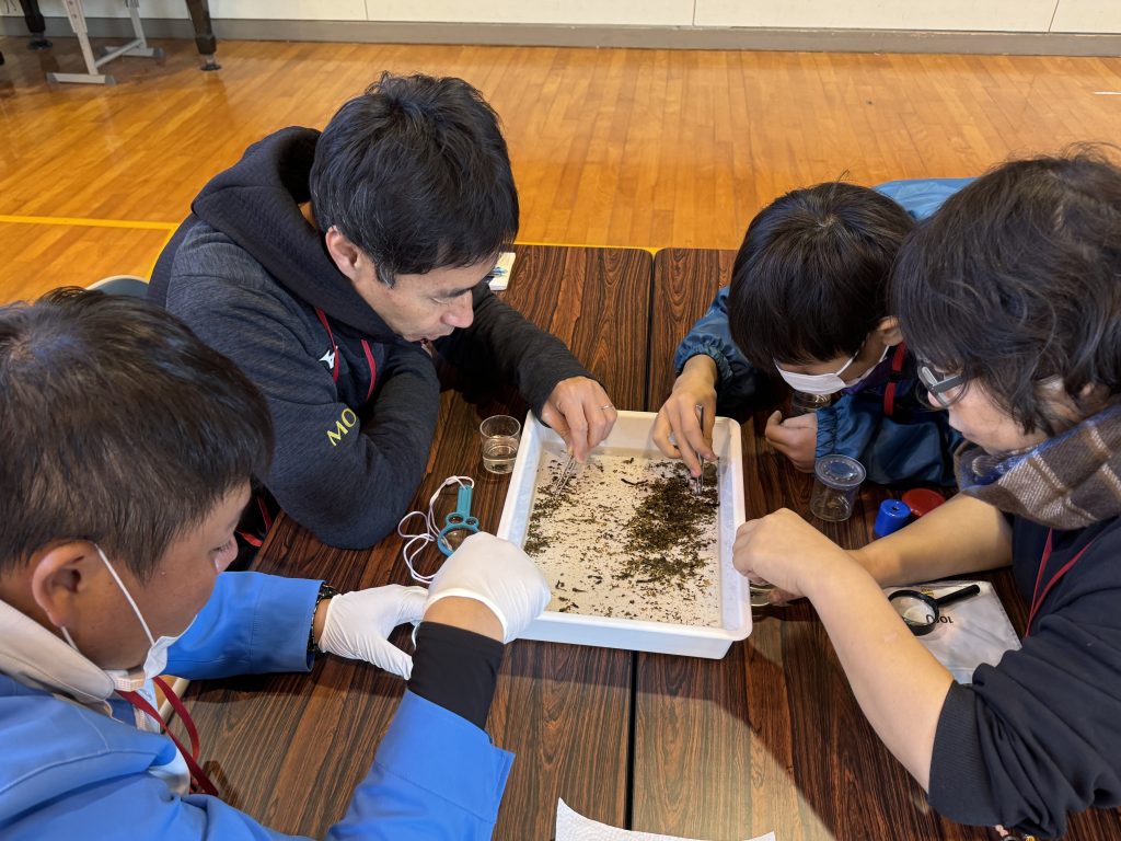 体育館の外に出て、海中で保管していた袋から泥状になったアマモをタライに取り出しました。そして、底に沈んだ種子を網ですくい、さらにトレーへと移し替えました。袋の中には貝や小さなカニがまぎれ込んでおり、生き物を見つけるたびに歓声が上がっていました。続いて、体育館の中に戻り、トレーの中から米粒ほどの大きさのアマモの種を一粒ずつピンセットで取り出し、ビーカーに移しました。講師から「熟成したアマモの種は水に沈む」と説明があり、受講者たちは真剣な表情で丁寧に選別作業を進めていました。その後、自然に分解される寒天粘土を用いて、思い思いの形に選別した種子を包んだ「種団子」を作りました。