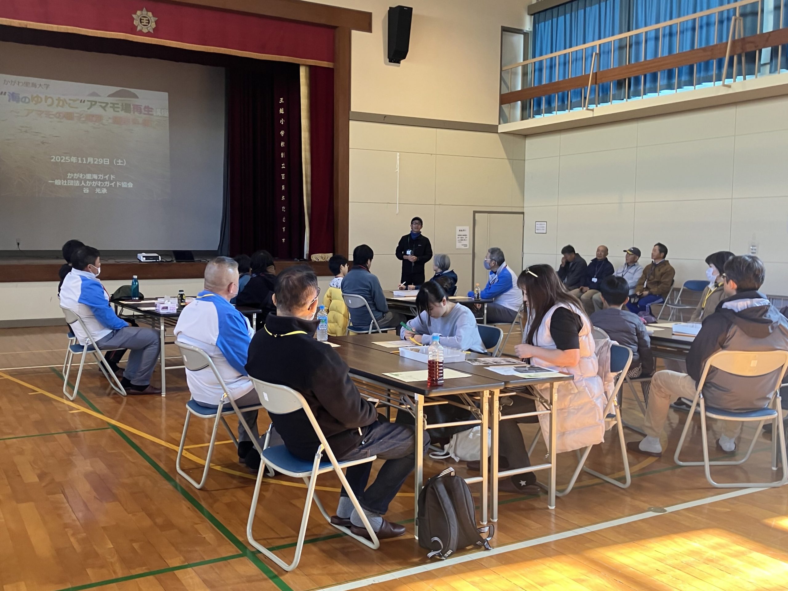 交流の里おうごしに戻り、振り返りとまとめを行いました。グループで感想を共有し、代表者が発表しました。「子どもでも参加できる活動なので、もっと多くの人に体験してほしい」「種の植え方にもいろいろな方法があることを知り、今回投げ入れた種がどのように育つか見守りたい」「昔は釣りをすると絡まるほどアマモが生えていたが、今は少ない状況に驚いた。海の水質について学ぶ講座も開催してほしい」といった意見がありました。